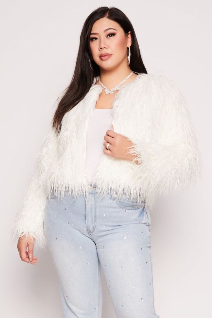 White faux-fur jacket layered over faded jeans crafts a snowlit fantasy.