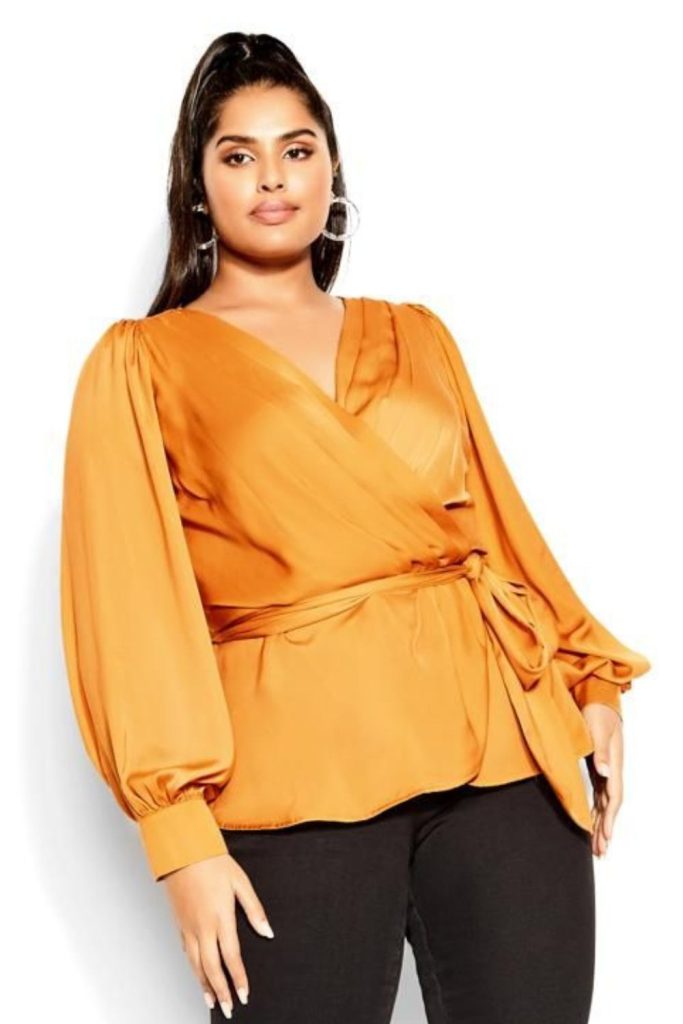 Mustard wrap top paired with dark denim jeans feels fierce and free.