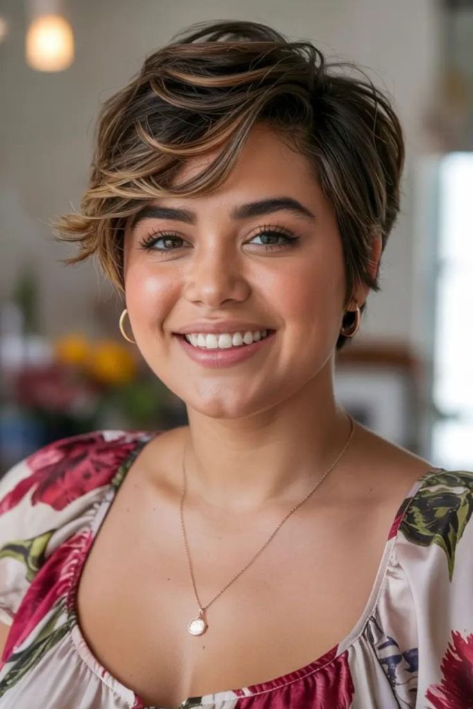 Layers staggered along sides soften round cheeks subtly. Finger-styling enhances sporadic movement producing casual chic.
