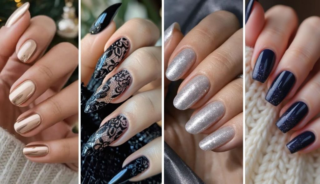 Shapes elongate fingers naturally. Tiny metallic accents add visual rhythm. Hands appear serene yet confidently polished.