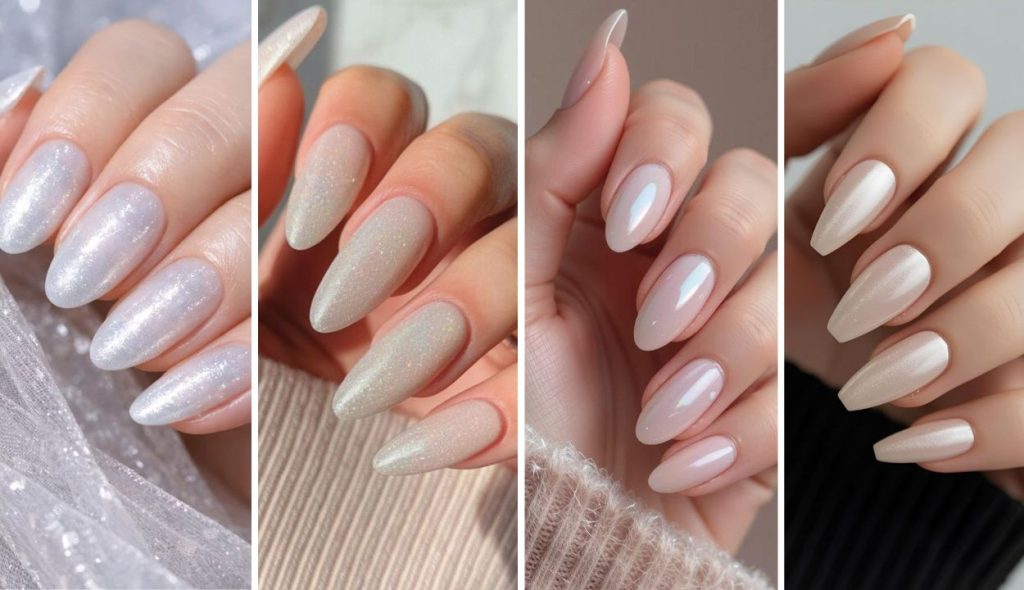 Translucent milky white infused with faint opalescent shimmer across nails.