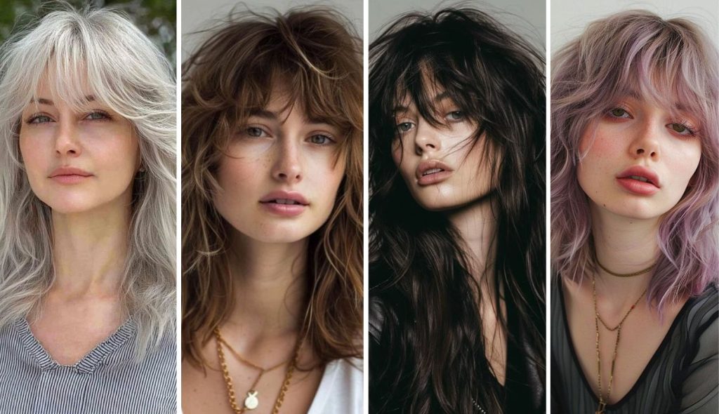 Layered cuts flare outward with restless energy. Curtain bangs slash diagonally across temples.