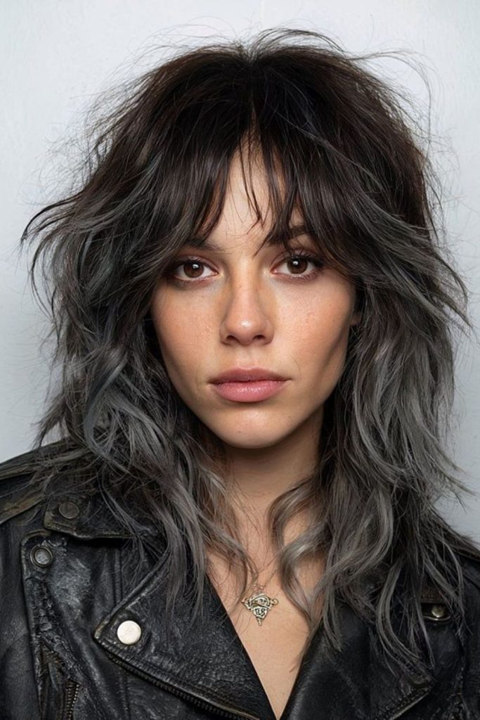 Jagged layers splay unpredictably over shoulders. Curtain bangs slice dramatically across temples.
