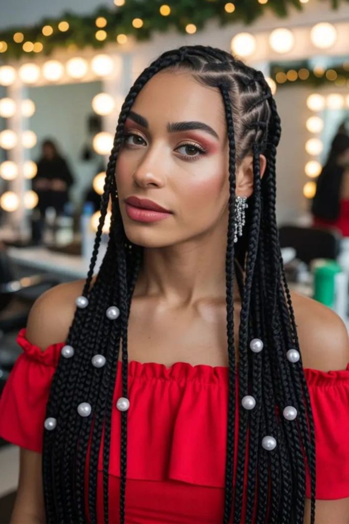 Braids threaded with frosty silver tips resembling frozen icicles sparkling subtly.