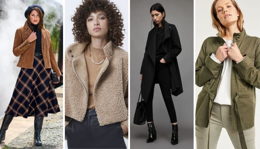 Top: Shearling jackets in caramel tones create tactile warmth beneath lightweight sweaters.