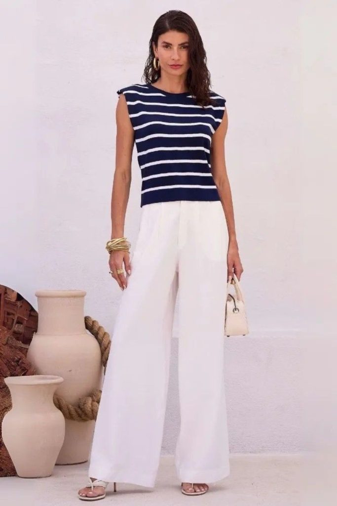 White linen pants trail softly, casual yet chic. Sunglasses perch like tiny mirrors reflecting sky.