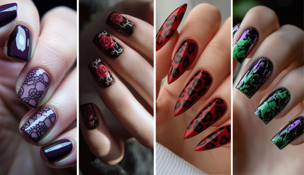 Matte finishes contrast with glossy roses whispering gothic sensuality.