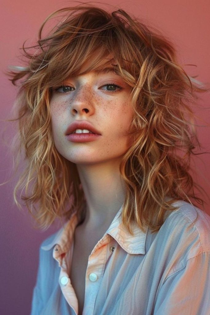 Warm, sun-kissed streaks fall in messy layers around shoulders.