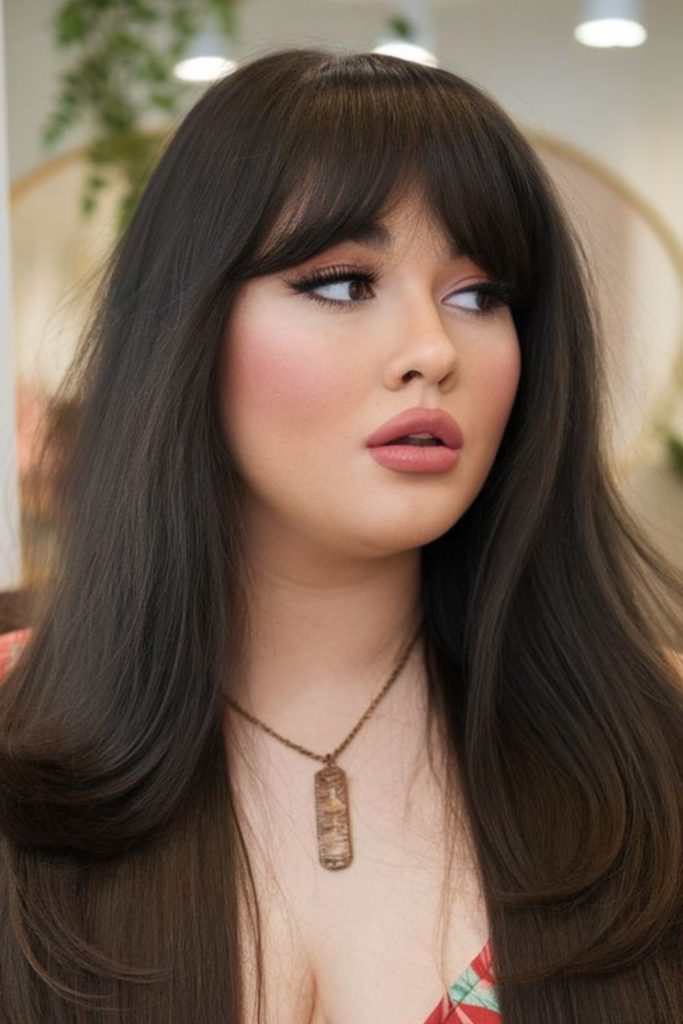 Curtain bangs frame cheeks softly yet cleverly slim roundness.