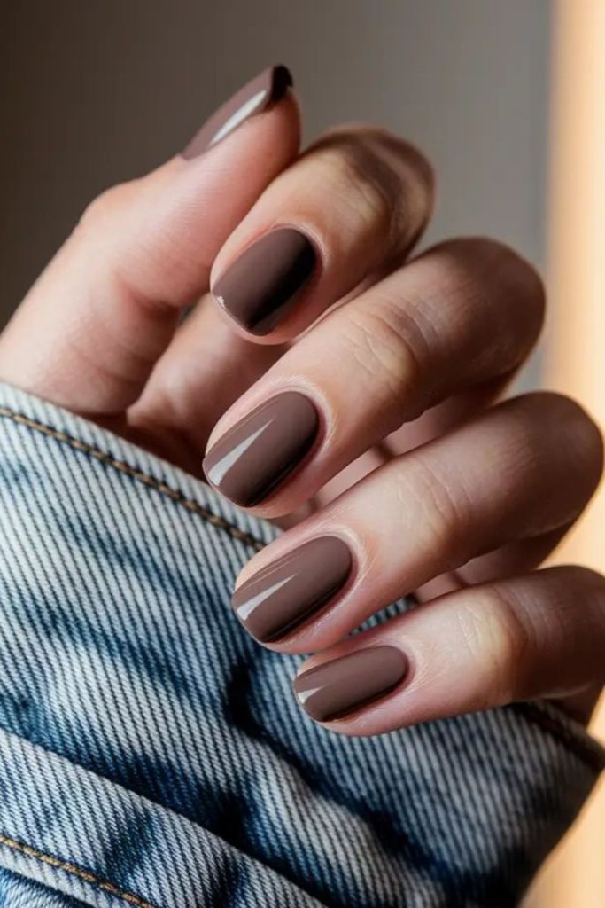 Truffle brown spreads around each nail like moody fog while glossy shine holds deep presence.