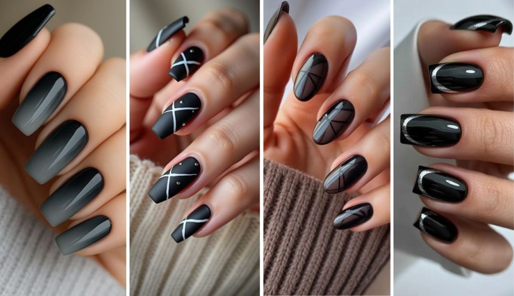 Small variation across nails adds playful rhythm. Minimalist dark charm hums subtly.