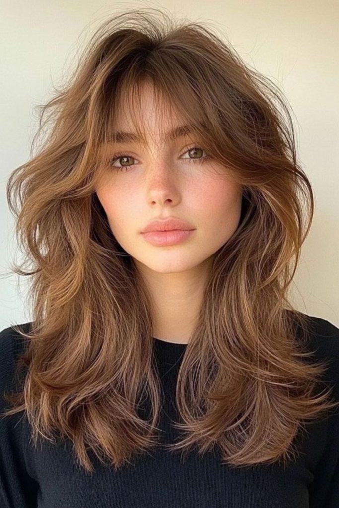Caramel tones cascade shoulder-length creating soft layered drama.