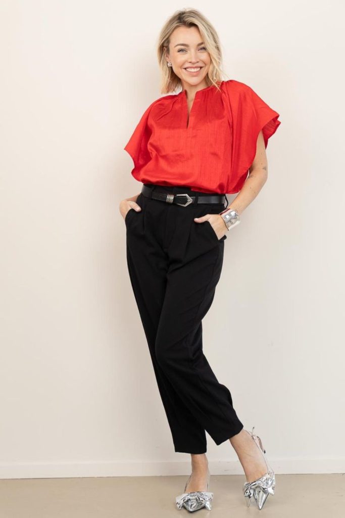 Top: Draped satin wrap blouse