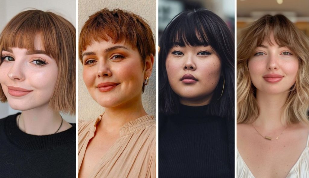 Curved fringe follows brow shape subtly. Facial roundness feels harmonized not emphasized.