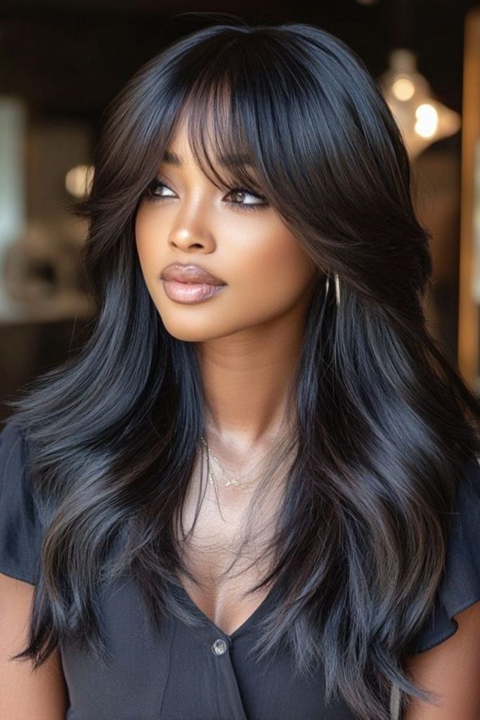 Glossy raven-hued strands flowing down exude depth and endless intensity.