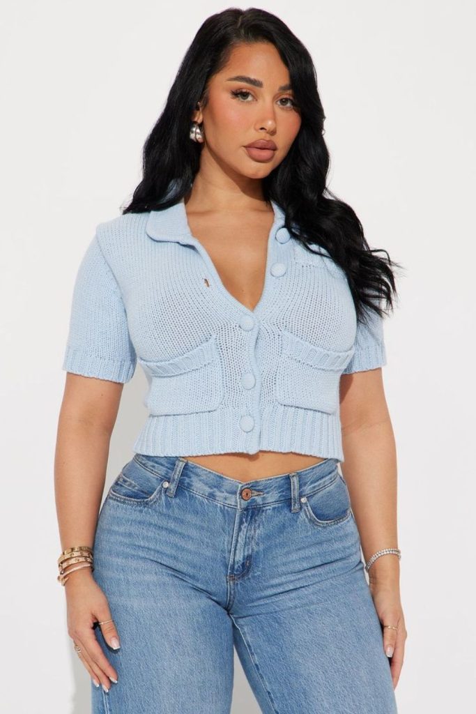 Top: Sky-blue oversized shirt