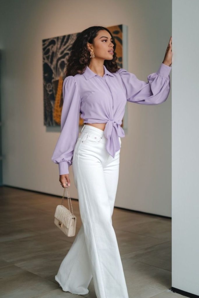 Lavender blouse drapes lazily over cropped wide-leg pants creating airy movement.