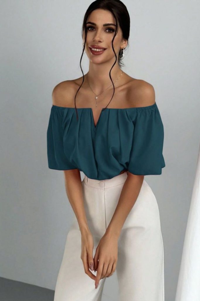 Top: Turquoise off-shoulder blouse