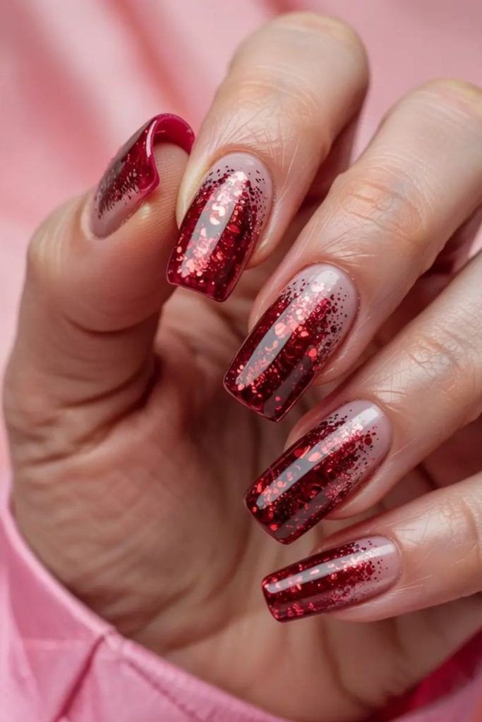 Scarlet flecks spill across muted nude bases bouncing erratically like runaway glitter bombs.