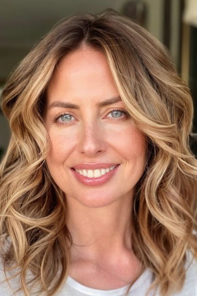 Loose waves spread gently around shoulders, exuding warmth and grace.