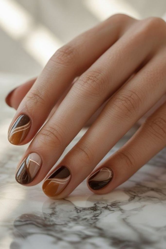 Warm caramel browns mingle with dusty creams softly across nails.