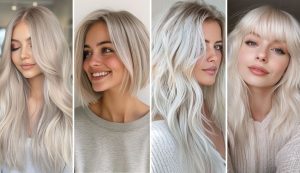 Platinum blond hair shines with a bright, icy, light reflective quality, and is effortlessly eye-catching; its cool silver derived colors create an elegant, stylishly